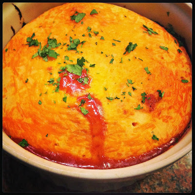 Turn oven down to 350 F. Coat a ceramic baking dish with non stick spray. Transfer the Chili to the dish and top with the Cornbread. Sprinkle a little more cheese on top and bake for 40 minutes, until the cornbread is done and has a nice color to it. Let rest for 5-10 minutes to set and garnish with some more cilantro.